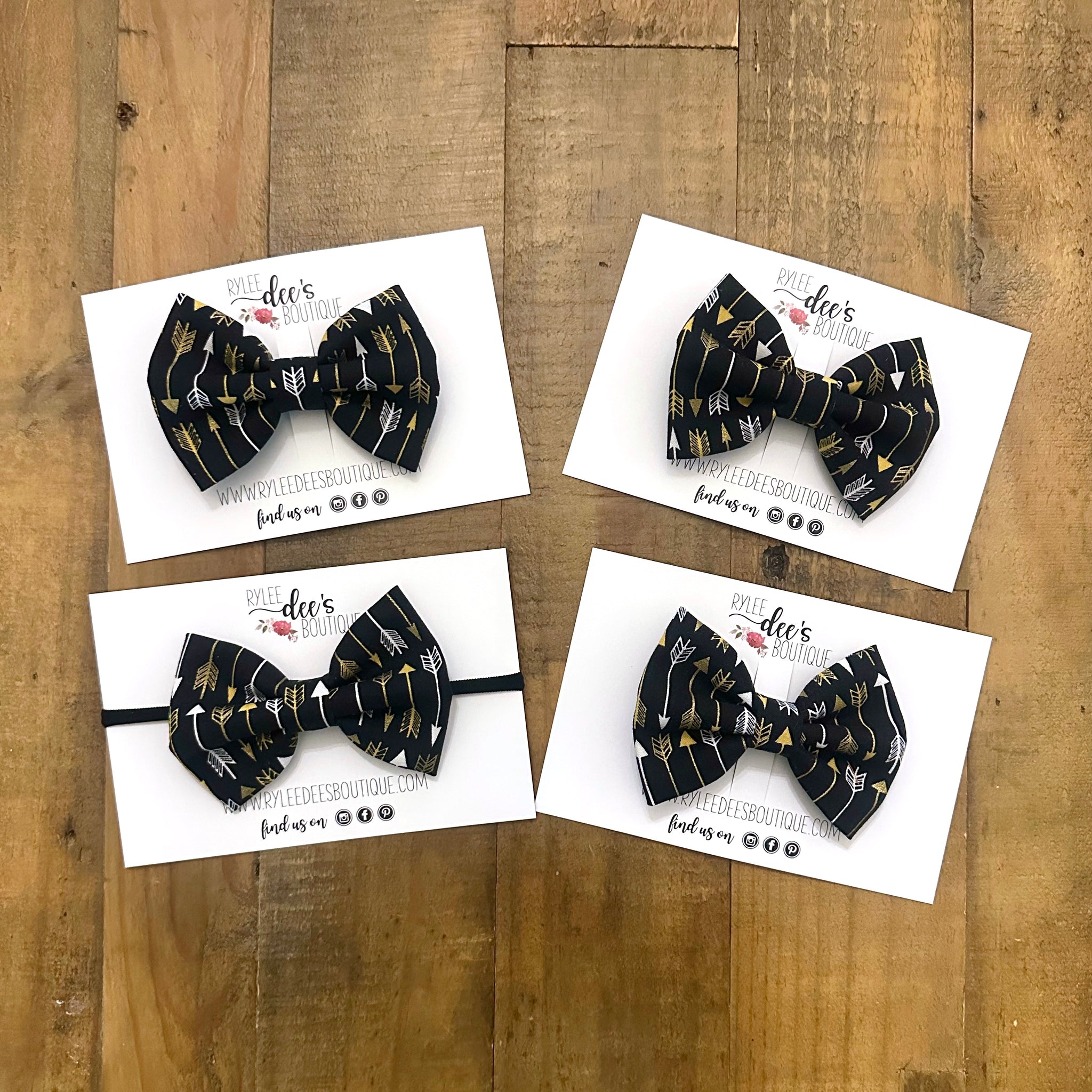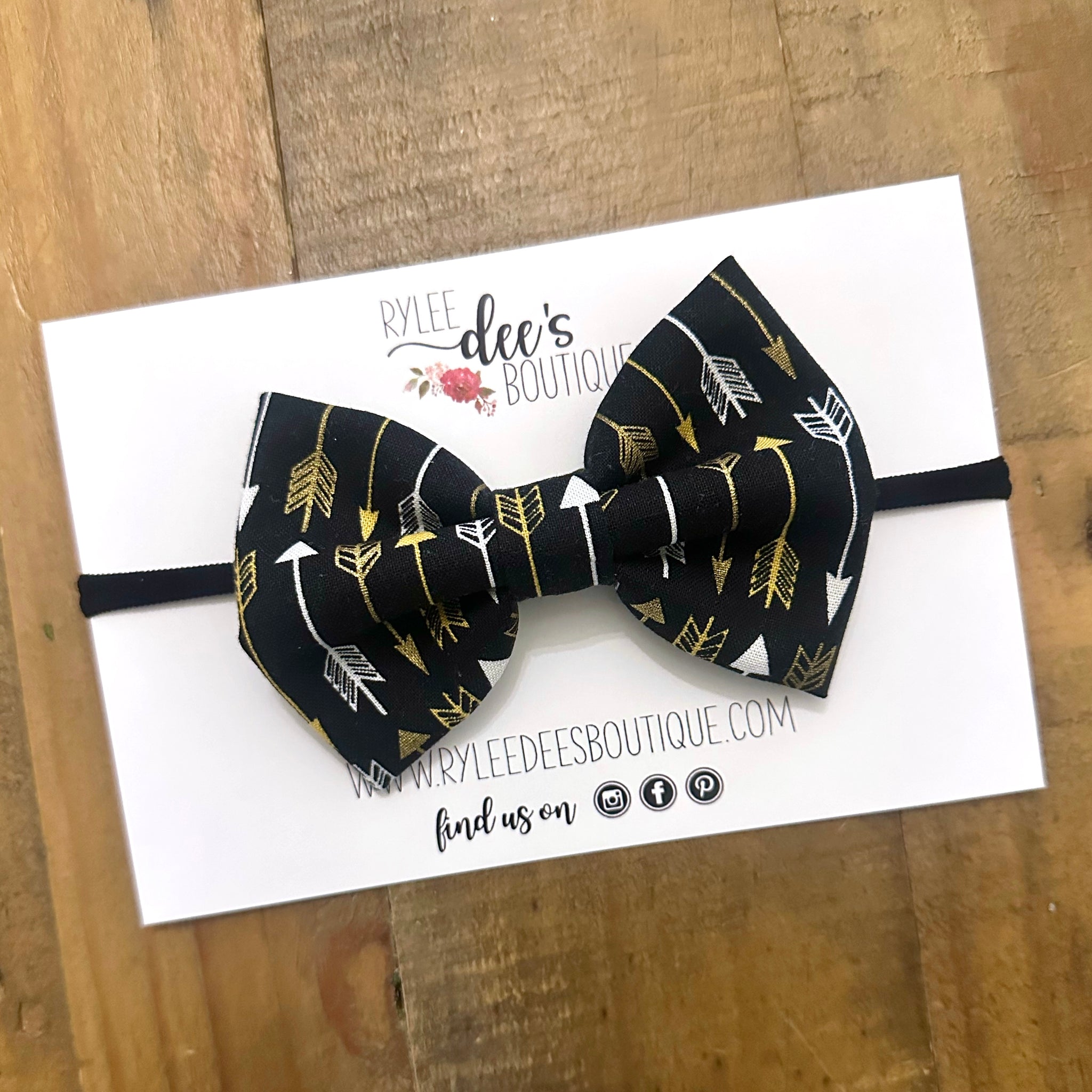 Where bold meets beautiful. This sleek black bow with metallic gold and white arrows is the perfect mix of modern and timeless. It is a must-have accessory for your little one’s wardrobe. This bow adds just the right touch of shine and style.