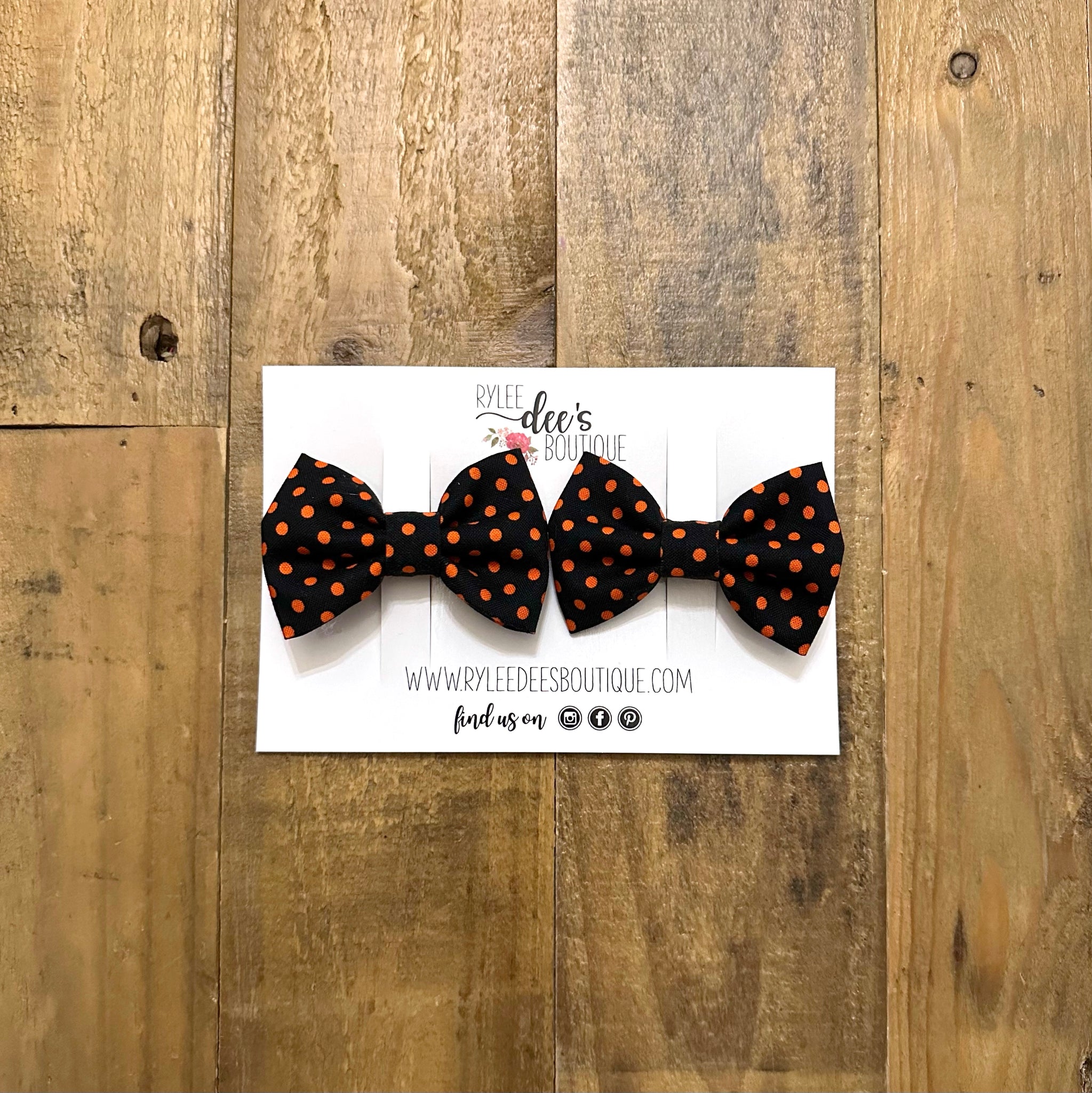 This mini Penelope bow is black with orange polka dots! It comes with the set of 2 for the best pigtail bows. It is made with 100% cotton.