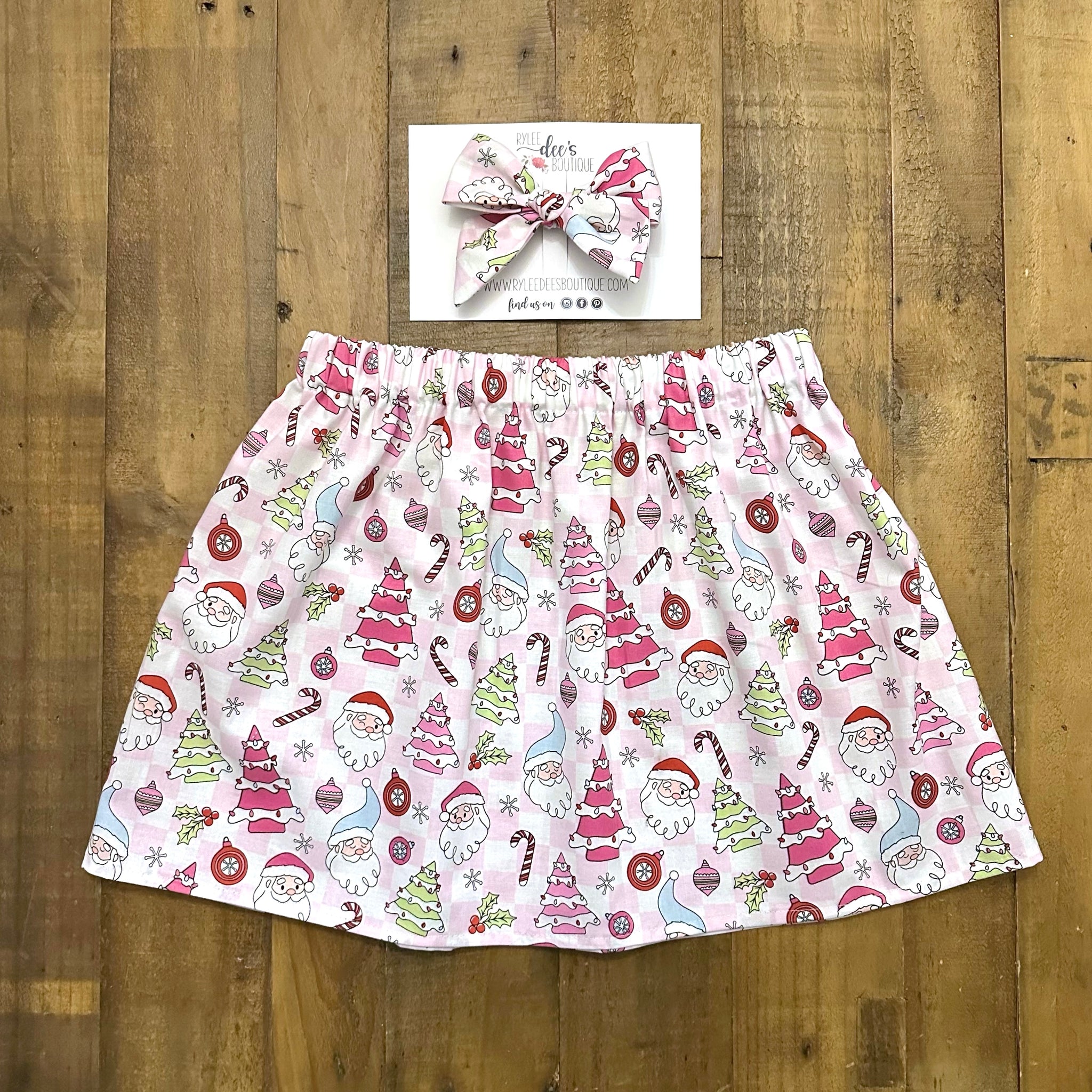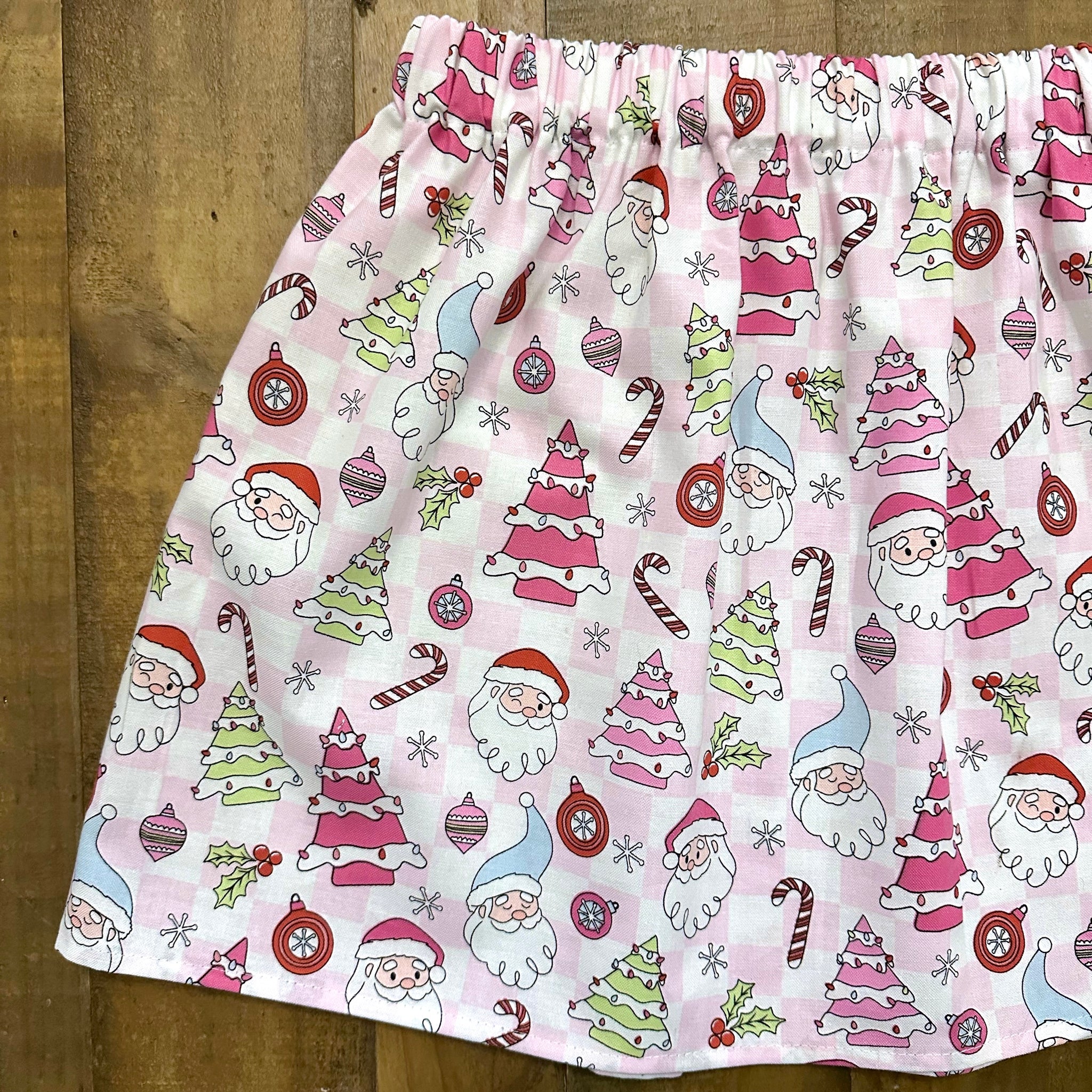 Whimsical Christmas meets sweet holiday nostalgia in this adorable skirt! With its pastel pink background, Christmas trees (that totally look like those little holiday cakes), jolly Santas, candy canes, and ornaments, it’s basically Christmas morning in clothing form. Perfect for cookie baking with Grandma, Christmas Eve twirls, or posing by the tree for those “remember forever” photos.