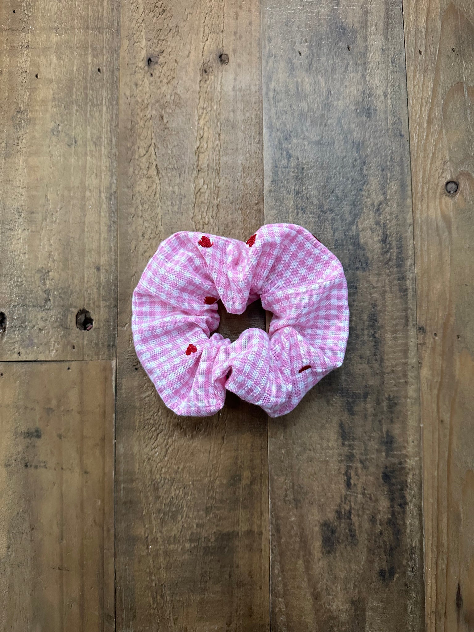 This Scrunchie has pink and white gingham with simple embroidered red hearts & is one size fits most.
