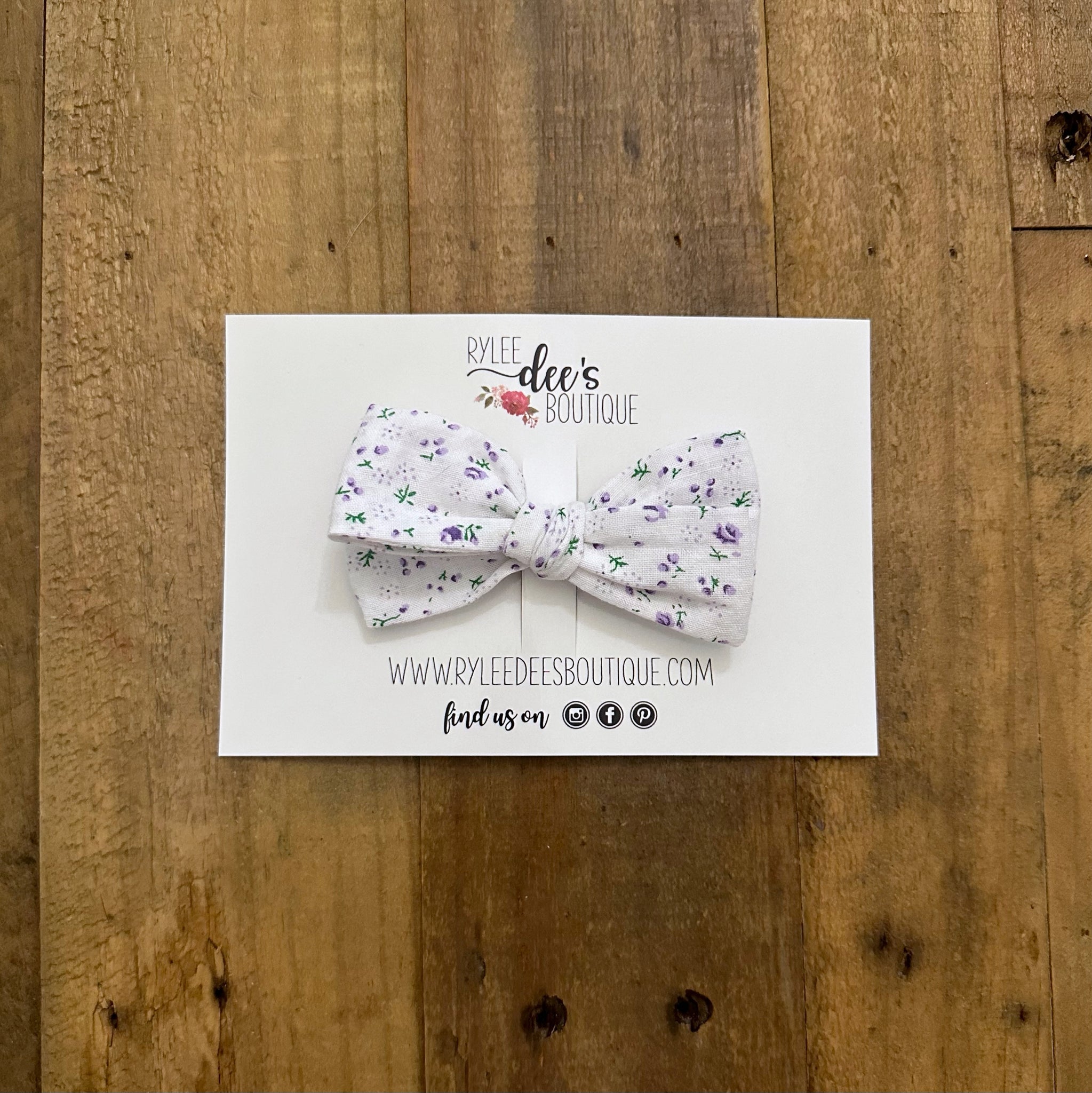 This regular Izzy Bow has a floral print. It is made with 100% cotton.