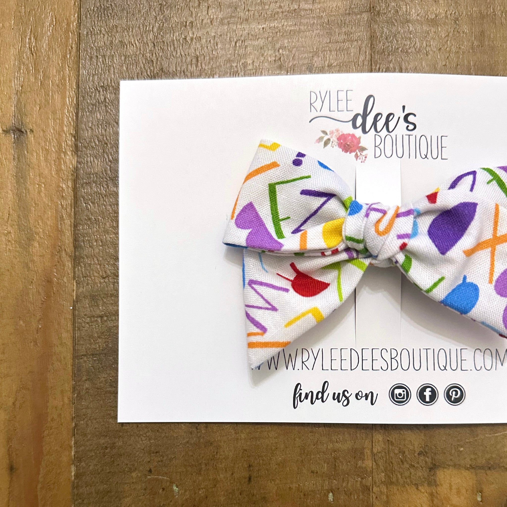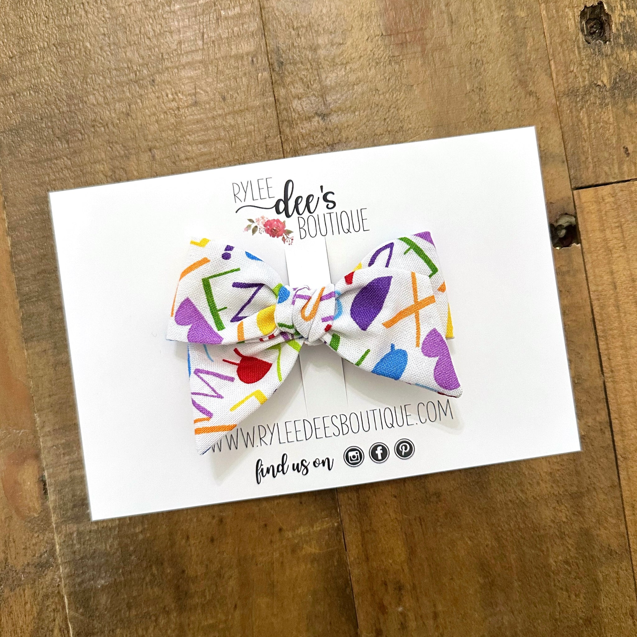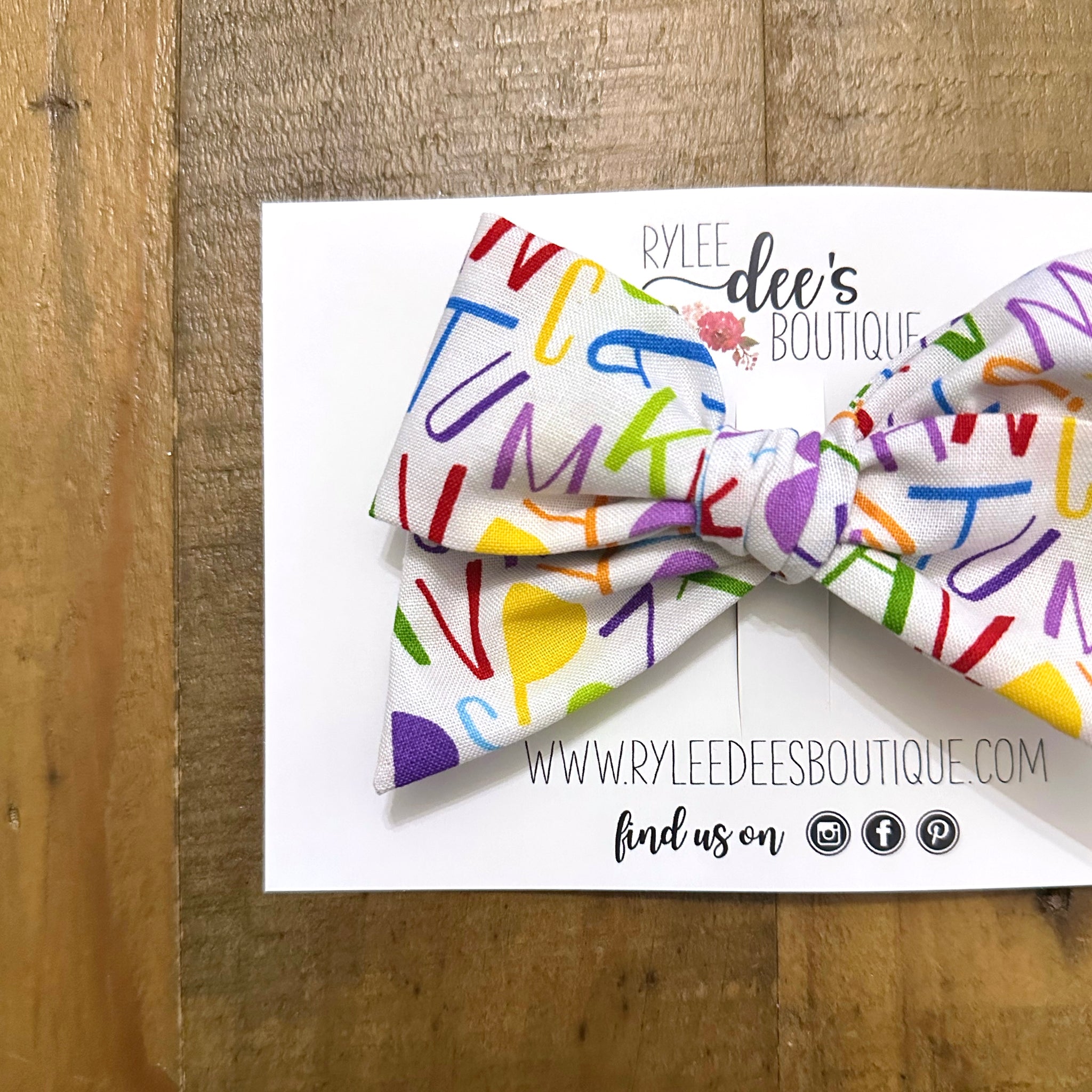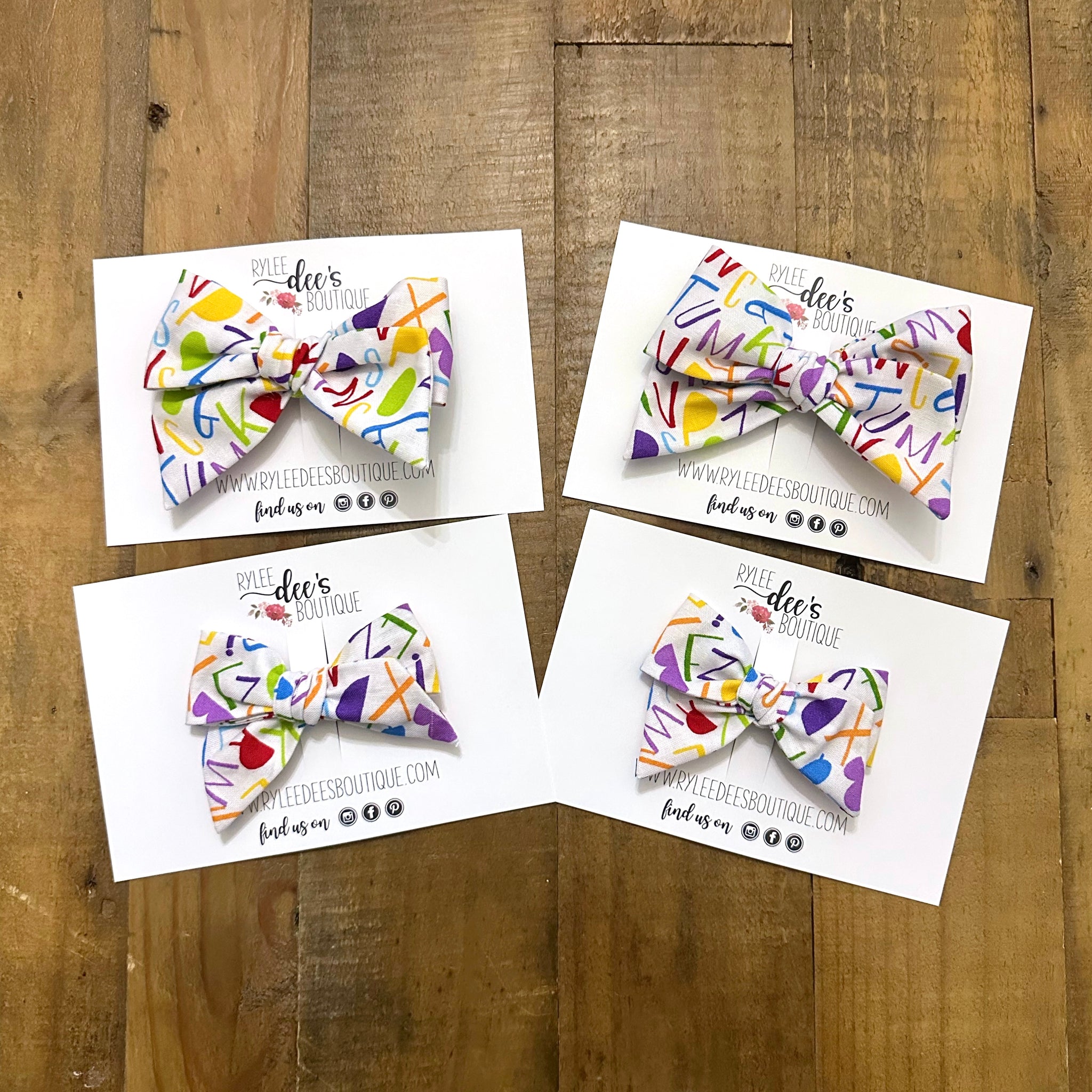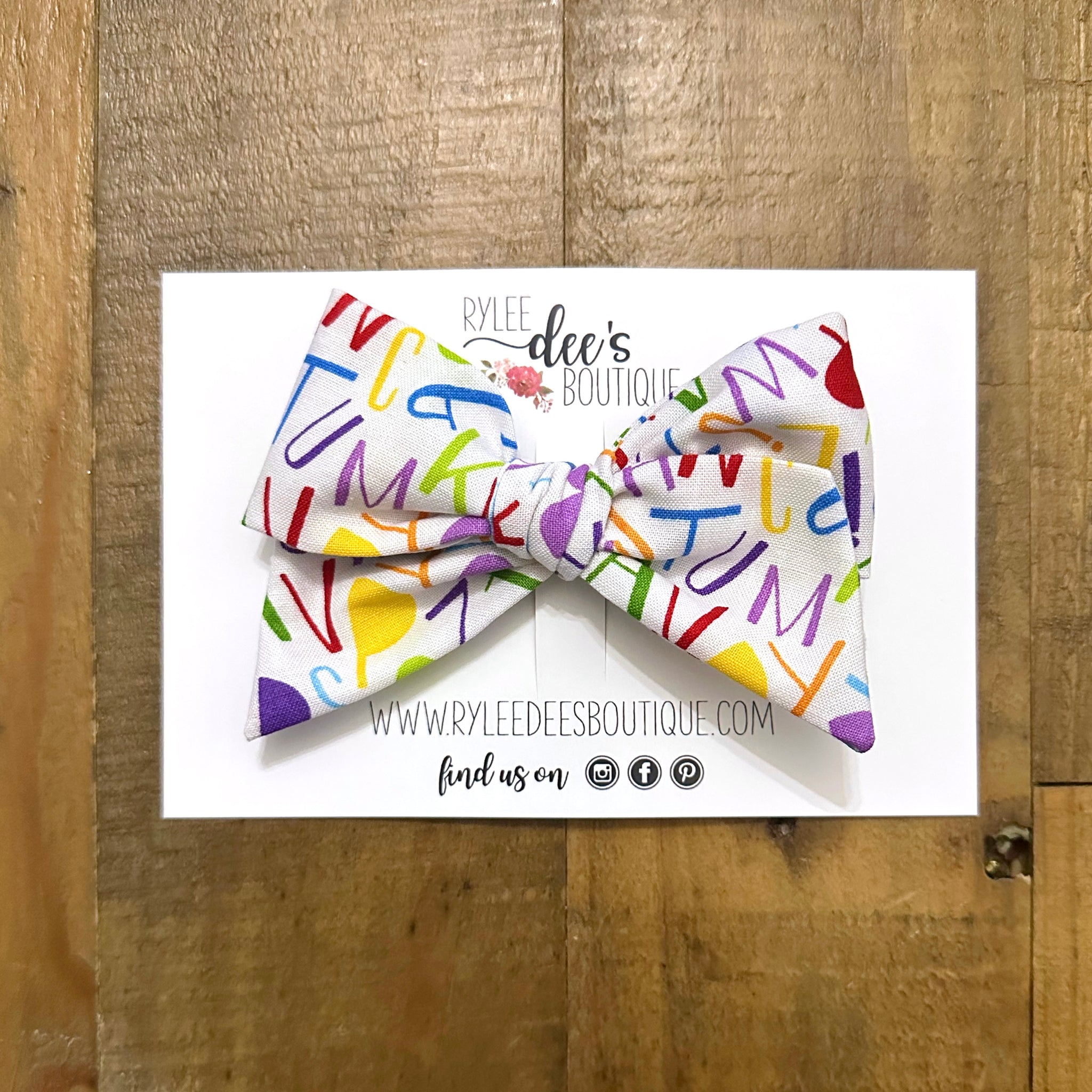 There's no better way to accessorize your school outfits or brighten up that school uniform! The "ABC" bow perfectly matches the school spirit vibes, bringing color to simplicity with bright hues and all the letters of the alphabet.