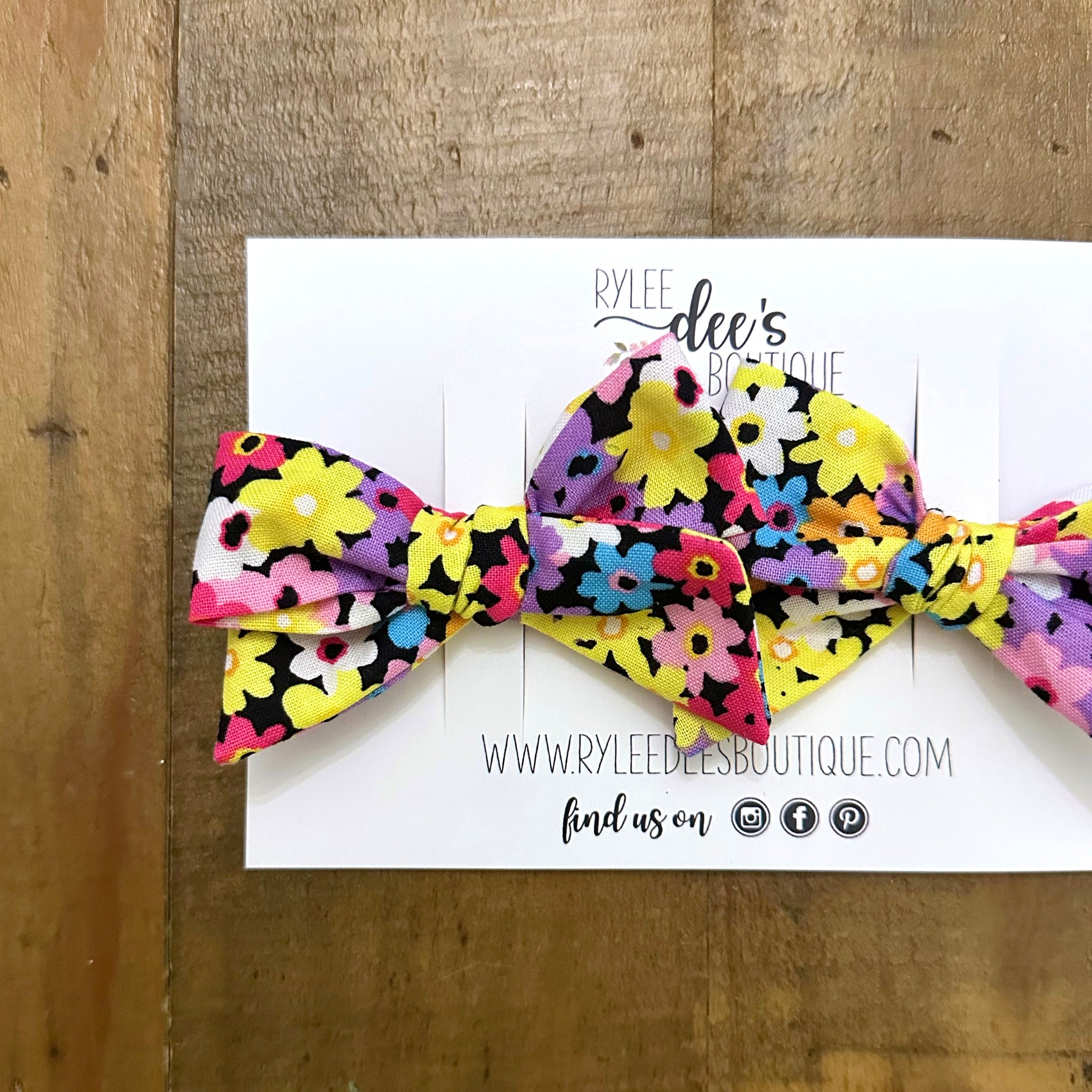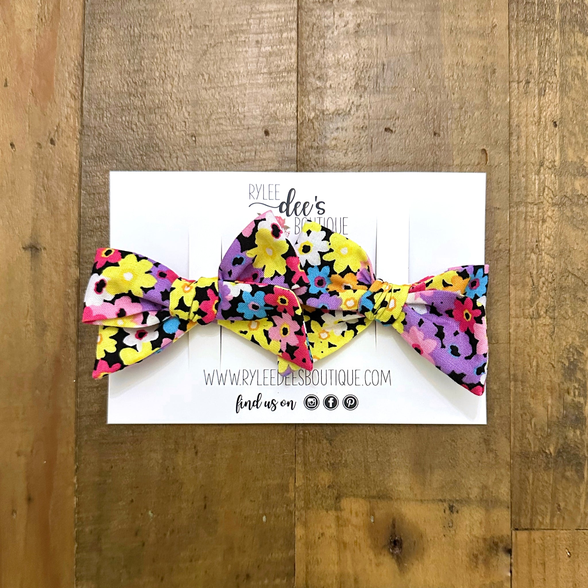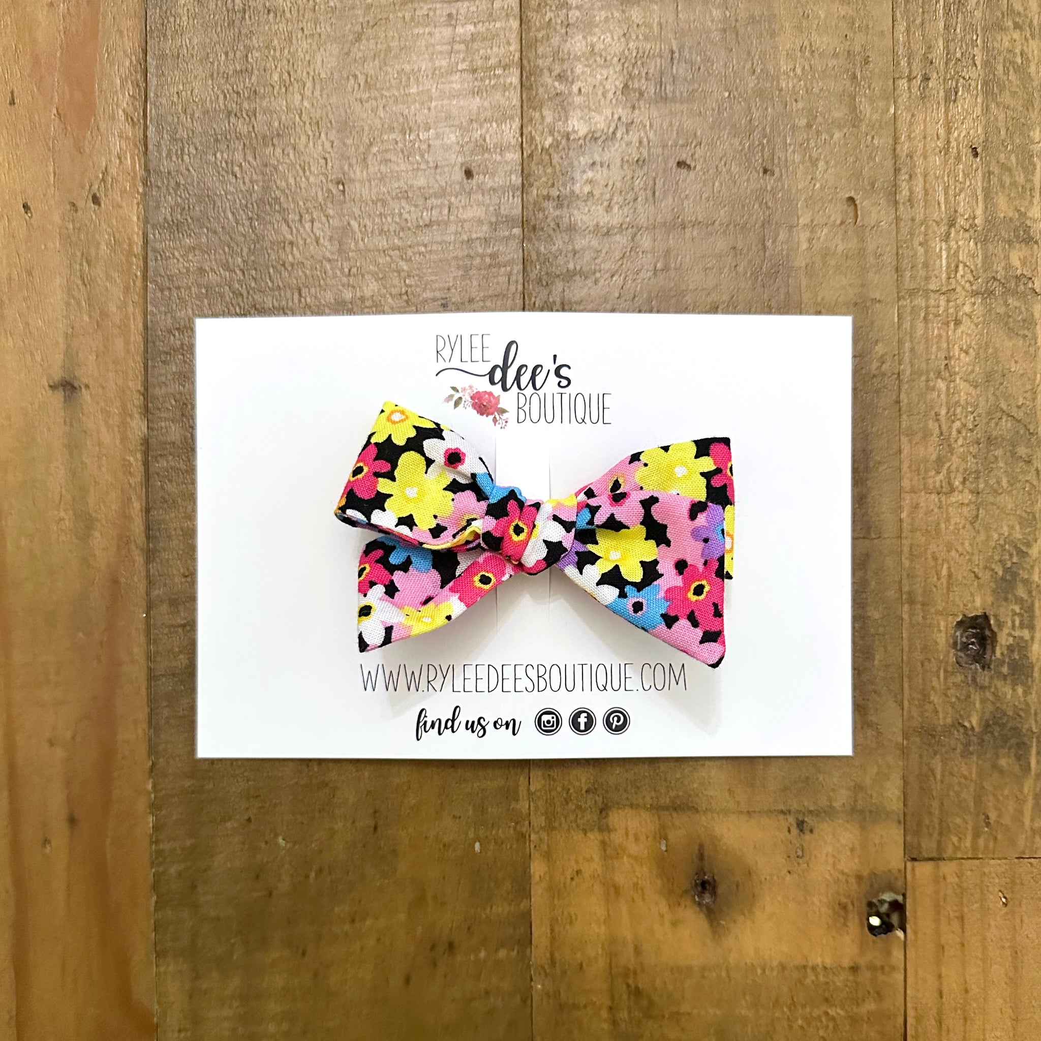 Add a burst of color and charm to your little one’s look with our vibrant floral mini Izzy Bow! It features a mix of cheerful daisies in bold pinks, purples, yellows, and blues - perfect for making any outfit pop. Ideal for everyday wear or adding a splash of fun to special occasions. Made with 100% cotton.